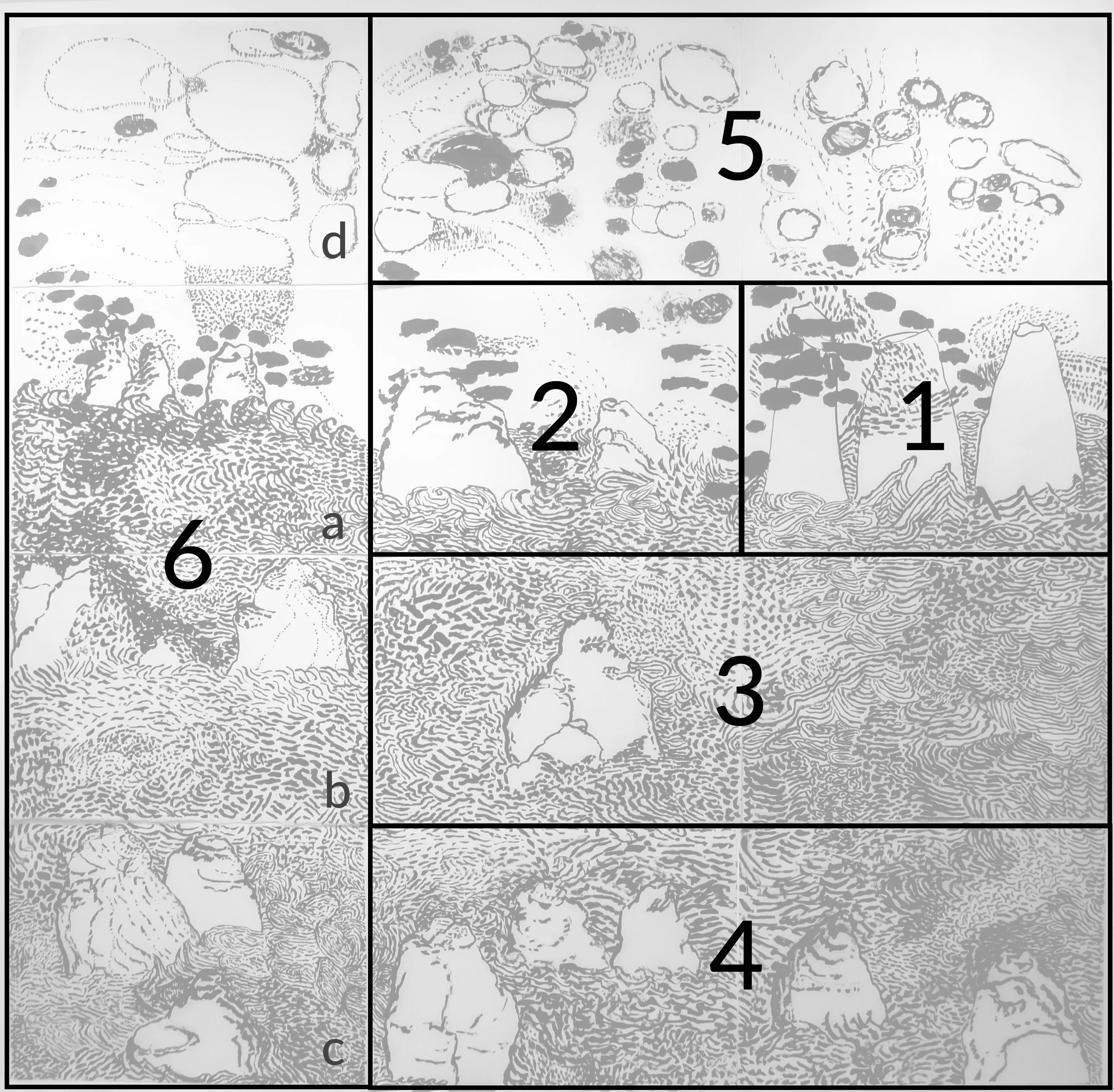 I began Fuji one sheet at a time, moving slowly across the surface until all twelve pages came together. This grid shows the six main sections in the order I worked, each one growing out of the last. Section 6 was completed in four parts, noted here as a–d.